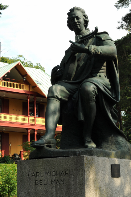 Hasselbacken har sitt namn av den hassellund som revs ned 1792, invid den krog som ett tag hette Dunderhyttan, och som var en mötespunkt för utflykter till Djurgården på Bellmans tid. Statyn är en bronsreplik efter Alfred Nyströms original i zink, som numera står i Kräftriket. August Strindberg satt modell för statyn från 1869.