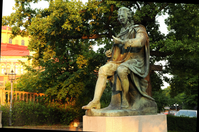 Hasselbacken har sitt namn av den hassellund som revs ned 1792, invid den krog som ett tag hette Dunderhyttan, och som var en mötespunkt för utflykter till Djurgården på Bellmans tid. Statyn är en bronsreplik efter Alfred Nyströms original i zink, som numera står i Kräftriket. August Strindberg satt modell för statyn från 1869.